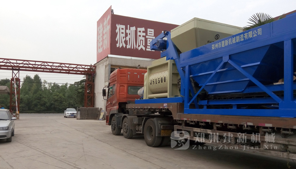 2015年7月13日,鄭州建新再發(fā)一套HZS75混凝土攪拌站設(shè)備,發(fā)往甘肅省。圖為JS1500混凝土攪拌機(jī)以及PLD2400混凝土配料機(jī)裝車過程。